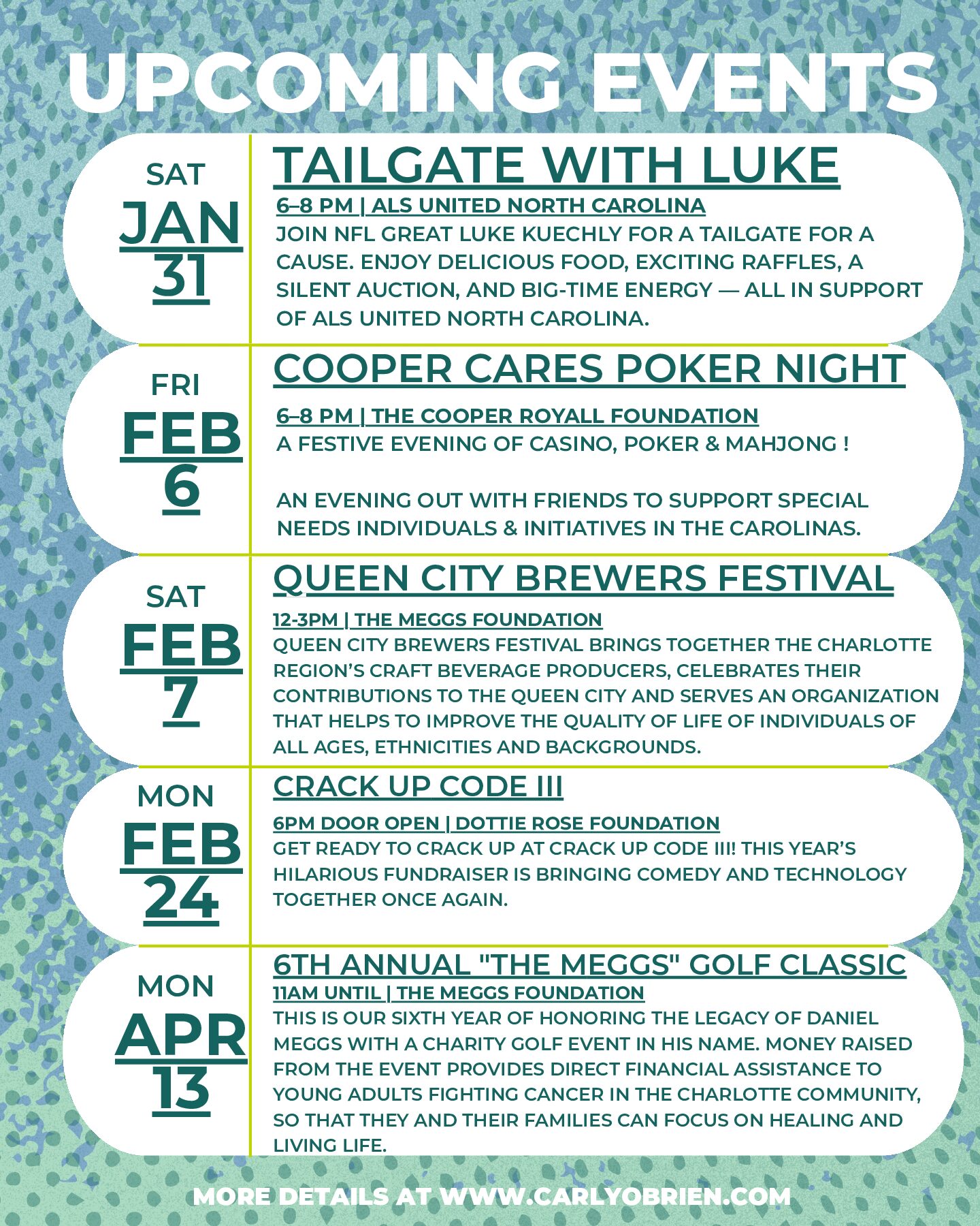 Time to join me at these amazing events happening in the first quarter of 2026!  The image above should be clickable to link to each event and if I have a code – I have included it!  Would love to see you all there – don’t be square! Some of these amazing causes are a must support!